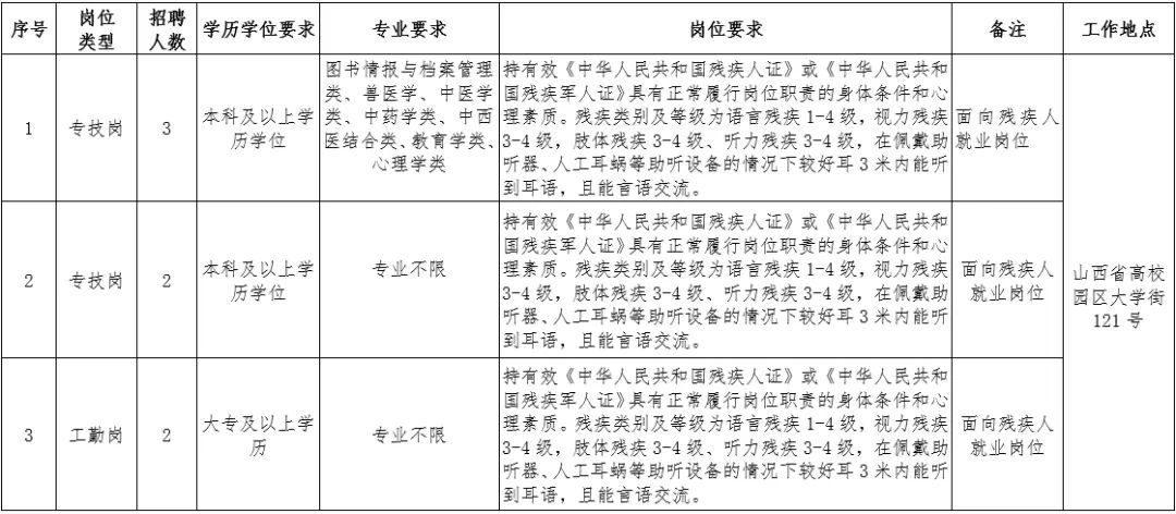 山西中醫藥大學2025年面向殘疾人公開招聘編外聘用制工作人員7名。招聘崗位所需的具體條件以《山西中醫藥大學2025年公開招聘編外聘用制工作人員崗位表》(附件1)的要求為準。